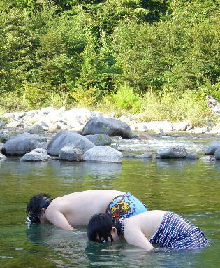 テントを張り終えて、汗だくだく。脇にある付知川に飛び込みます。川は冷たくて、気持ちい~い。でも、遊んでばかりでは困ります。自分の晩ごはんは、自分で確保。今は‘やす’が使用禁止なので、‘タモ’で「アジメドジョウ」を追いかけます。唐揚げにすると美味しいです。