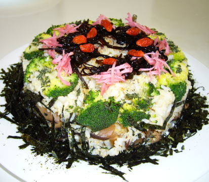 ・押し寿司:梅酢とゆず酢を使った玄米ご飯に蒸し人参・しいたけを混ぜ、高野豆腐をそぼろにして、春らしくターメリックで色付け