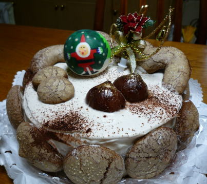 側面に丸く焼いたビスキュイ・ショコラを貼り付け、オーナメントを飾って完成。