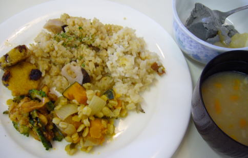 は美味しい紅安納芋が手に入ったので、それに舞茸ときびを炊き込んだご飯を持って行きました。Aさんは「レンコンとキヌアのたこ飯風」。