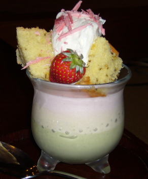 ②i-cafe、3月のメニューより「春の三色パフェ」。緑とピンクのムースが綺麗。