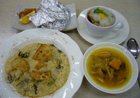 平茸の玄米リゾットカリカリれんこんチップ載せ~。混ぜ混ぜをTさんが一生懸命して下さって、絶妙のとろみ具合。