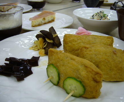 玄米いなり寿司は、ごはんに紅しょうが・梅酢・切ごま・椎茸・にんじんをまぜこんだ一口でお得(?)なバージョン。きゅうりの車輪がかわいいブーブー型。先生のところは男の子さんなので、小さい頃にこうして作ってあげていたんでしょうか。お皿がかわいくなりました。