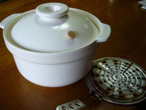はこれが無いと料理出来ない位。煮物の時も使えるしー」とか言って歩いています。マクロビオティックの教室に行かれた方はご存知ですが、それ以外は知られていないみたいですね。「どこで?」と良く聞かれます。はい、自然食品店ならあると思います。写真の土鍋は「マスタークック」。これは「炊飯用・6合」の品。これでご飯を炊くと、むちゃくちゃ美味しい。お正月に七草がゆを炊いたら、今でも時々家族からリクエストが来ます。先回の講座では‘ごぼうの丸煮’で使用しました(教室用ので)。ご存知の方も多いのですが、普通の土鍋は水が付いた状態や、空の状態で使えませんが、ここのはOK。ガスから外してすぐ洗い始めても割れませんし、金だわしでゴシゴシしてもびくともしません。蓄熱性抜群、ハード使用に耐える優れものです。これも一生ものとしてお薦めです。