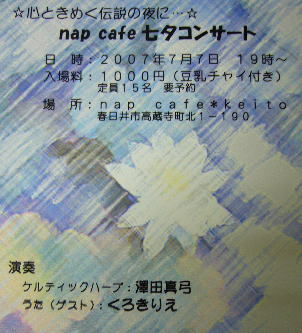春日井にあるnap cafe・keitoで「七夕コンサート」がありました。演奏はケルティックハープの澤田真弓さん。nap cafeの生姜の効いた‘豆乳チャイ’(美味しかったー)をいただきながら、ケルトの生演奏。真弓さん自ら録音してきたという鳥のさえずりや、水の音をバックにたっぷりアイルランドミュージックに浸ってきました。
