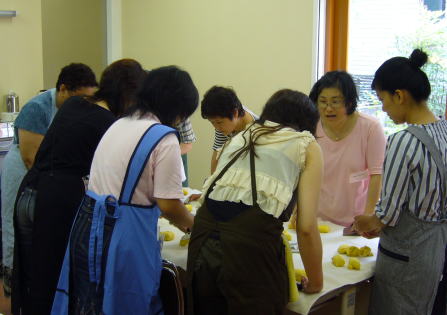 自分の分は自分で作りましょう!と言う事で、皆さん真剣にこねこね。丸めもだんだんお上手になって来ました。今回もマクロビオティック仕様、そう、今日なんか油まで使わず(前回はなたね油を少し使いました)、小麦・酵母・水・塩・そしてべジとしてかぼちゃのみで作ります。かぼちゃの皮とわたは地粉と甘味のレーズンでおまけのクッキーに変身!種だって勿論食べられるし、捨てるところはありませんよー。