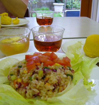今日のデリはライスサラダ。玉ねぎに‘アーリーレッド’を使ったら「あれー、キレイ~」。ドレッシングは梅雨の季節なので、梅干(←自家製だよー)をたたいてペーストにしたものを梅酢と混ぜて作りました。