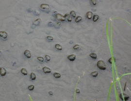 (近くの水路にタニシが沢山。食べられるかな?)